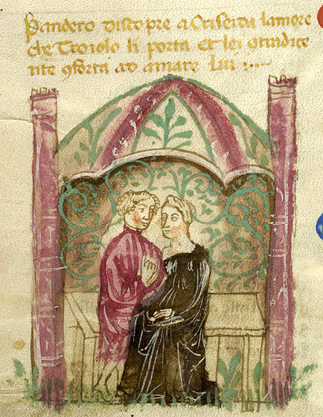 New York, Pierpont Morgan Library, M 371, f. 11v. Il copista del manoscritto, datato ottobre 1414, è Pace di Giuliano da Olibano. Pandaro corteggia Criseide per conto dell'amico Troiolo.