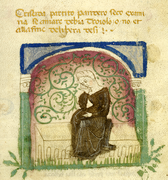 New York, Pierpont Morgan Library, M 371, f. 13v. Il copista del manoscritto, datato ottobre 1414, è Pace di Giuliano da Olibano. Criseide siede da sola, preda della malinconia.