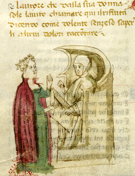 New York, Pierpont Morgan Library, M 371, f. 28v. Il copista del manoscritto, datato ottobre 1414, è Pace di Giuliano da Olibano. L'autore Giovanni Boccaccio si rivolge ad una donna 'ex cathedra'.