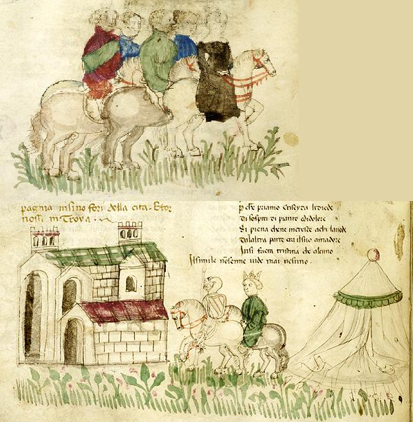 New York, Pierpont Morgan Library, M 371, f. 38v. Il copista del manoscritto, datato ottobre 1414, è Pace di Giuliano da Olibano. Una scorta di uomini a cavallo accompagna Criseide all'accampamento greco; Antenore, scortato da un cavaliere armato, lascia l'accampamento greco per dirigersi verso Troia.