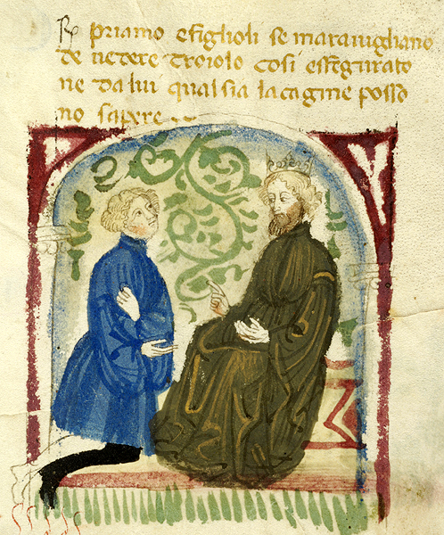 New York, Pierpont Morgan Library, M 371, f. 48r. Il copista del manoscritto, datato ottobre 1414, è Pace di Giuliano da Olibano. Troiolo si inginocchia dinanzi a Priamo.