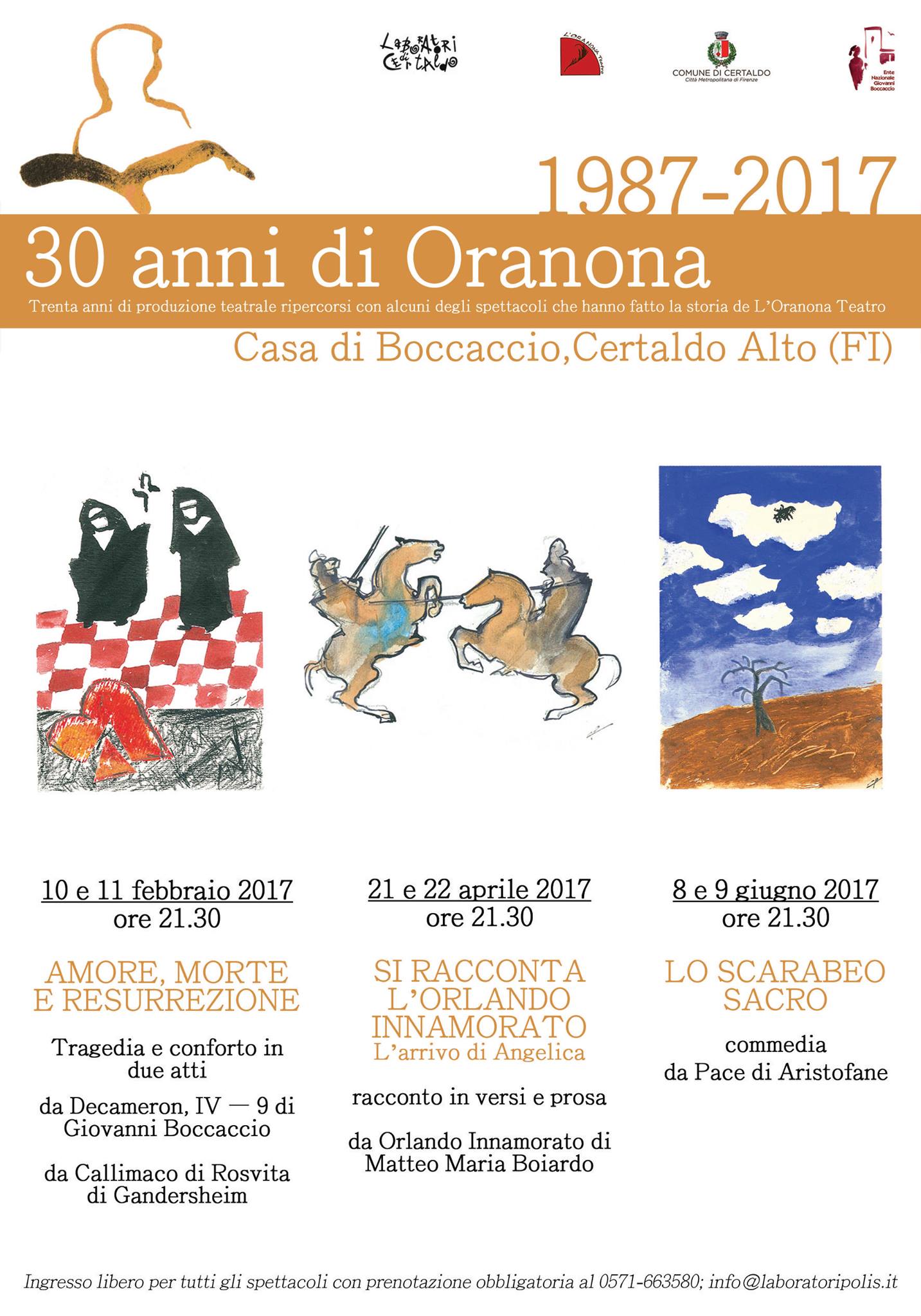 Per celebrare questo traguardo, L'Oranona Teatro e il suo animatore di ieri e di oggi, il regista Carlo Romiti, presentano una mini rassegna di tre spettacoli che si svolgeranno a partire dal venerdì 10 febbraio fino al venerdi 9 giugno, con cadenza bimestrale.