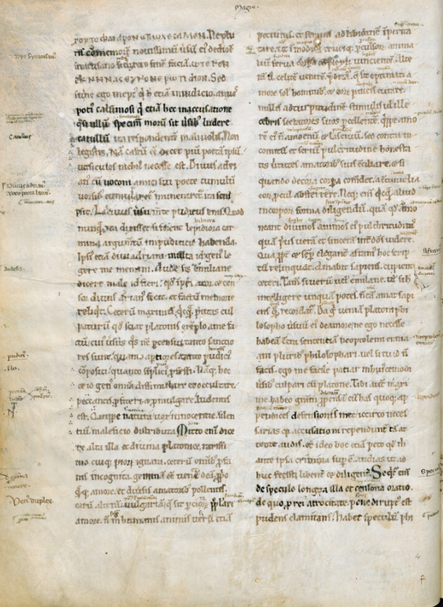 Membr., cc. VI + 277 + V’, mm. 340 × 255, sec. XIII (prima metà). L. Apuleius, "De magia", "Metamorphoseon libri", "Floridorum libri". Proveniente dal monastero di Montecassino, passò per un periodo nello scrittoio del B., sicuramente già a partire dagli anni ’30, e contiene alcuni suoi marginalia: brevi annotazioni paleograficamente databili agli anni ’40 (ad. es. le postille introdotte da «Nota» nel margine superiore della c. 37), maniculae (ad es. cc. 3v, 6r, 30v, 45v, 52v, 77r), fiorellini e graffe (ad es. cc. 29v e 52v); forse autografa anche una testina disegnata nel margine di c. 6v. Numerose annotazioni di Zanobi da Strada in tutto il codice (ad es. c. 24v), alcune delle quali precedentemente attribuite da Casamassima e Vio erroneamente al B. (ad. es. le postille e i notabilia lasciati alle cc. 39v-54r); da assegnare a Zanobi anche lo "Spurcum additamentum" a "Metamorphoseon libri", X 21 (c. 66r), insieme alle rubriche «APULEJ META.I.» (c. 24r) e «APULEI PLATONICI FLORID(ORUM) LIB(ER).I.» (c. 73v), che la Rafti aveva proposto di assegnare al B. (cfr. per quest’ultimo punto la parte finale della sezione introduttiva della scheda). Annotazioni di Pietro Piccolo da Monteforte (ad es. c. 63r) e di altre mani del XIV secolo; nel margine inferiore di c. 79v si legge «F. Aretin(us)», vergato in una minuscola cancelleresca databile tra la fine del XIV e l’inizio del XV secolo.