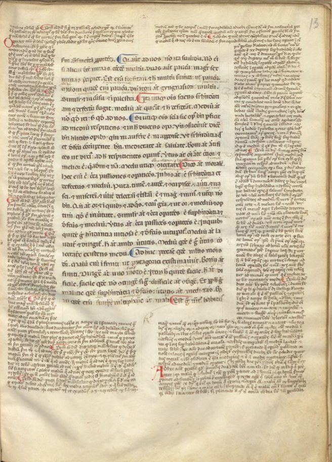 Membr., cc. II + 86 + I’, mm. 330 × 235, sec. XIV. Aristoteles, "Ethica Nicomachea" (con il commento di Tommaso d’Aquino). Segnatura della magna libraria: V 9. Di mano del B. soltanto il commento tomistico, ad eccezione delle prime 16 righe, di mano del copista del testo (c. 1r), aggiunto attorno al 1340 e da lui sottoscritto (c. 86v). Di mano del B. anche: frequentissime annotazioni interlineari, alcune postille marginali, talvolta racchiuse in cornici (ad es. c. 60v), diverse maniculae (ad es. 13r), graffe e fiorellini (c. 7v).