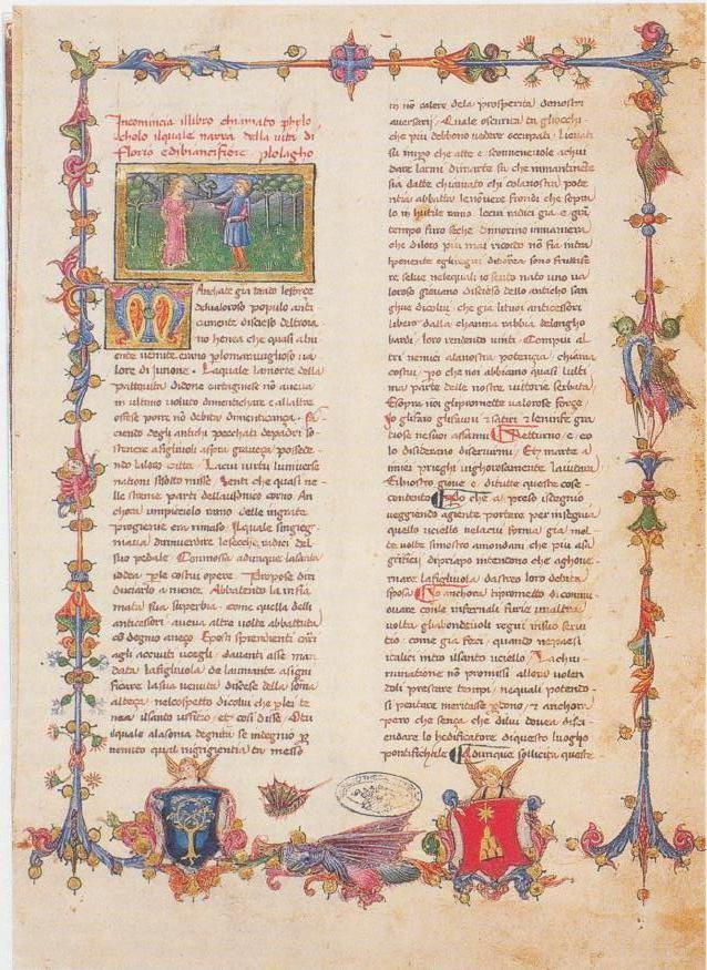 Città del Vaticano, Biblioteca Apostolica Vaticana, Chig. L.VI.223, f. 1r. Il copista del manoscritto, datato 13 dicembre 14[51?], è Bartolomeo d'Andrea di Tuccio. Florio e Biancifiore a colloquio in un prato; nel fregio sono presenti gli stemmi dei Chigi e dei Della Rovere.
