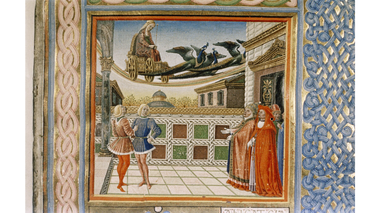 Oxford, Bodleian Library, Canon. Ital. 85, f. 1r. Il copista del manoscritto è Andrea de Laude (Andrea da Lodi). All'interno di un cortile due giovani uomini, insieme ad un papa e un cardinale accompagnati dal loro seguito, osservano Giunone attraversare il cielo su un carro trainato da tre pavoni.