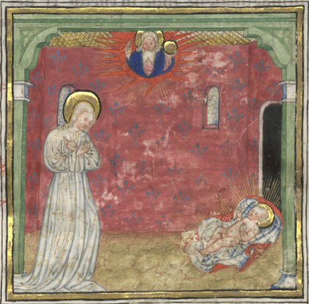 Kassel, Universitätsbibliothek Kassel, Landesbibliothek und Murhardsche Bibliothek der Stadt Kassel, 2° poet. et roman. 3, f. 3r. La Vergine Maria adora il Bambino Gesù, mentre in alto compare Dio benedicente con un globo dorato nella mano, sorretto da una mandorla di serafini.