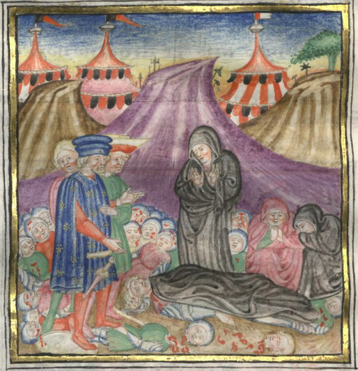 Miniatore lombardo (1450 c.), Ascalion esorta Giulia a cessare il suo pianto