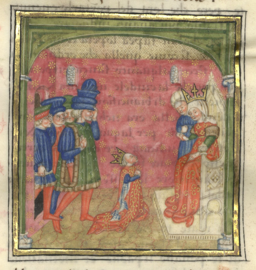 Kassel, Universitätsbibliothek Kassel, Landesbibliothek und Murhardsche Bibliothek der Stadt Kassel, 2° poet. et roman. 3, f. 39r. Biancifiore, inginocchiata dinanzi alla regina, riceve istruzioni su come comportarsi durante il banchetto, mentre alle sue spalle sono in attesa il siniscalco ed altri uomini.