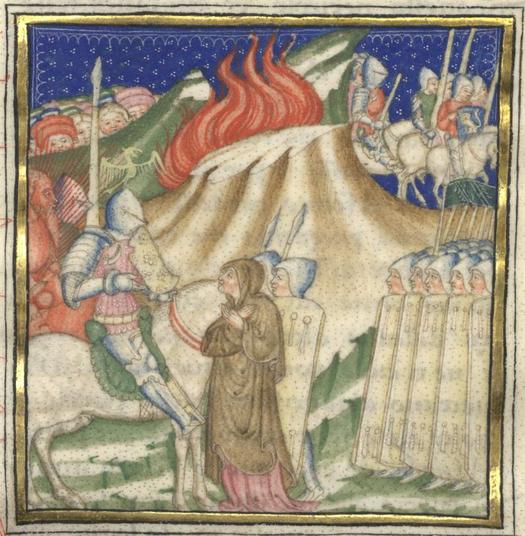 Kassel, Universitätsbibliothek Kassel, Landesbibliothek und Murhardsche Bibliothek der Stadt Kassel, 2° poet. et roman. 3, f. 57r. Florio e Biancifiore conversano in attesa del ritorno del siniscalco, il quale in lontananza sulla collina insieme ad un gruppo di uomini armati.