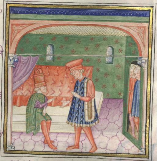 Miniatore lombardo (1450 c.), Florio confida al duca le sue pene