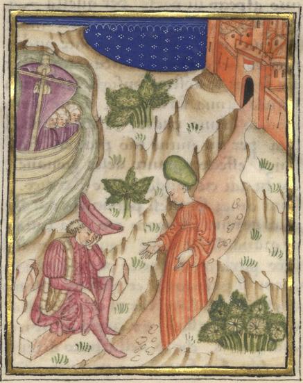 Kassel, Universitätsbibliothek Kassel, Landesbibliothek und Murhardsche Bibliothek der Stadt Kassel, 2° poet. et roman. 3, f. 137r. Approdato in Sicilia, Filocolo siede melanconicamente mentre Sisife gli si rivolge.