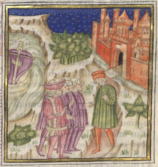 Kassel, Universitätsbibliothek Kassel, Landesbibliothek und Murhardsche Bibliothek der Stadt Kassel, 2° poet. et roman. 3, f. 138r. Sbarcati a Rodi, Filocolo e i suoi compagni incontrano un amico di Ascalion, Bellisano, mentre si dirigono verso la città.