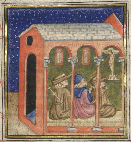 Kassel, Universitätsbibliothek Kassel, Landesbibliothek und Murhardsche Bibliothek der Stadt Kassel, 2° poet. et roman. 3, f. 190v. Filocolo e il suo compagno ascoltano Ilario illustrare la fede cristiana, illuminati dai raggi emanati dal crocifisso.