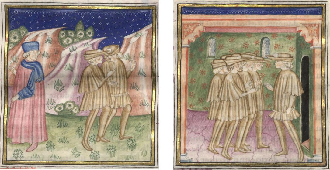 Kassel, Universitätsbibliothek Kassel, Landesbibliothek und Murhardsche Bibliothek der Stadt Kassel, 2° poet. et roman. 3, f. 194r. La carta presenta due miniature: Filocolo e Menedon si congedano da Ilario discutendo tra loro; Filocolo si rivolge ai compagni radunati intorno a lui.