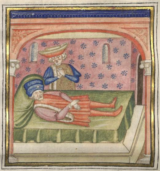 Kassel, Universitätsbibliothek Kassel, Landesbibliothek und Murhardsche Bibliothek der Stadt Kassel, 2° poet. et roman. 3, f. 200v. Florio piange la morte di Ascalion accanto al corpo dell'amico.