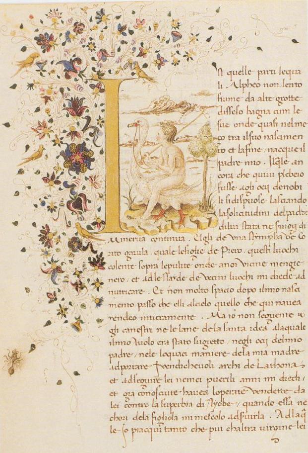 Città del Vaticano, Biblioteca Apostolica Vaticana, Vat. Lat. 5206, f. 36v. Il copista del manoscritto è stato identificato con Michele Salvatico. Un fanciullo cavalca un cigno tenuto con una briglia dorata, all'interno dell'iniziale figurata I(n quelle). Si tratta dell'unica illustrazione completata del manoscritto.