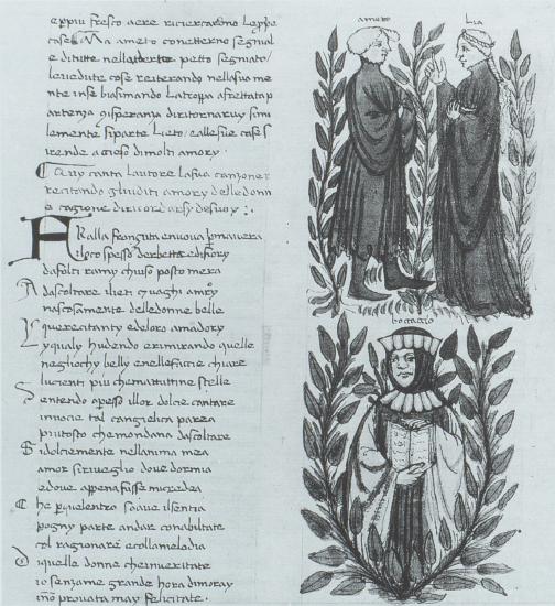 Firenze, Biblioteca Nazionale Centrale, II.II.17, f. 50v. Il copista del manoscritto, datato 1414, è Andrea di Pierino da Firenze. Ameto e Lia, ritratti a figura intera, conversano tra loro; in basso, ritratto a figura intera dell'autore Giovanni Boccaccio con un libro, all'interno di una cornice frondosa.