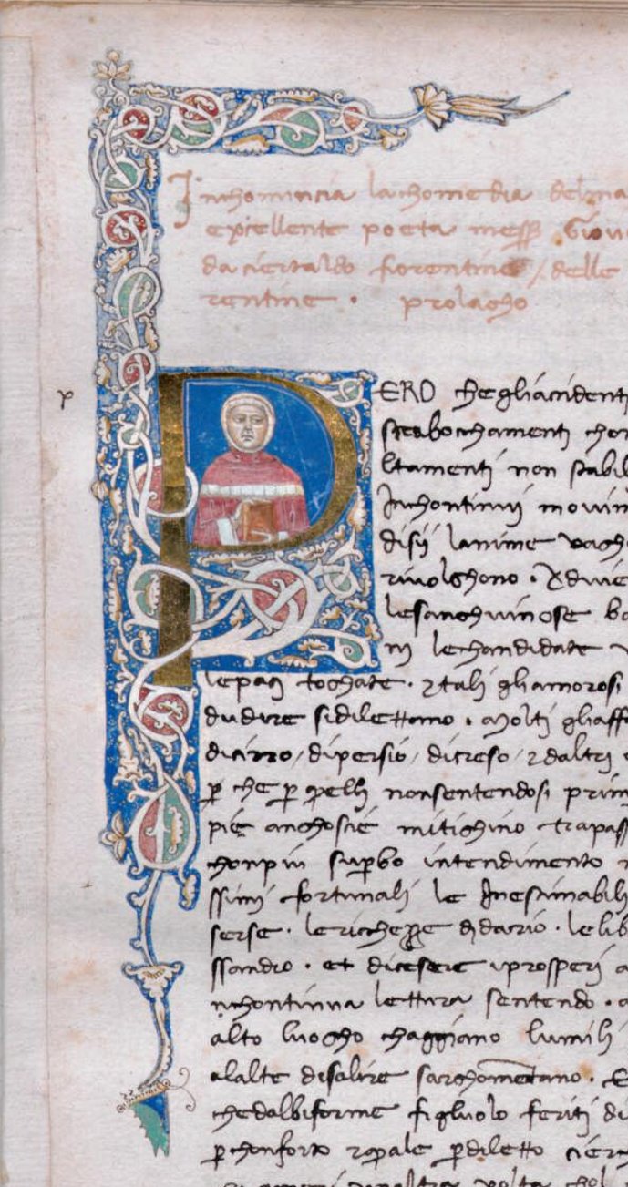 Firenze, Biblioteca Medicea Laurenziana, Plut. 41.35, f. 1r. Ritratto a mezzobusto dell'autore Giovanni Boccaccio con un libro tra le mani, all'interno dell'iniziale figurata P(erò).