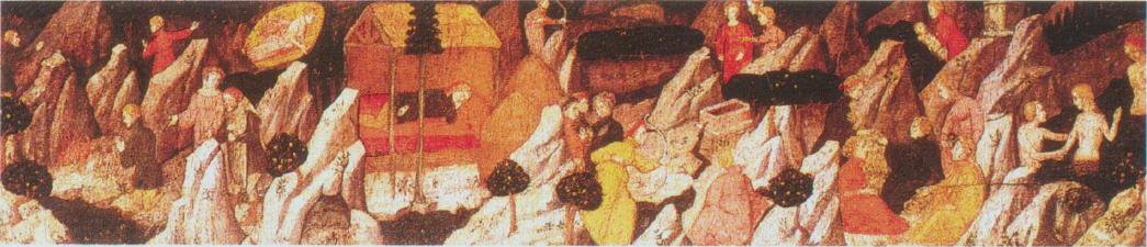 Ubicazione ignota. Sono raffigurati alcuni episodi del Ninfale fiesolano: Mensola scaglia un dardo contro Africo (in alto); Africo, inginocchiato davanti al fuoco, compie un sacrificio a Venere; Venere appare in sogno ad Africo; Africo partecipa alla caccia delle ninfe travestito da donna ed uccide il cinghiale (in alto); il banchetto delle ninfe; Mensola tenta di sfuggire alle insidie di Africo, il quale ha rivelato la sua identità durante il bagno alla fonte; Mensola regge Pruneo tra le braccia (in alto a destra). Fronte di cassone.