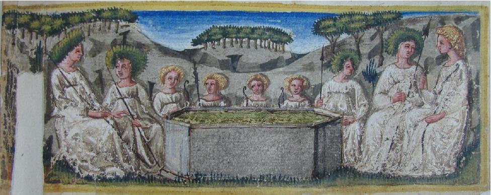 Venezia, Biblioteca Nazionale Marciana, It. IX. 63, f. 1r. Diana siede con un gruppo di ninfe intorno ad una fonte.
