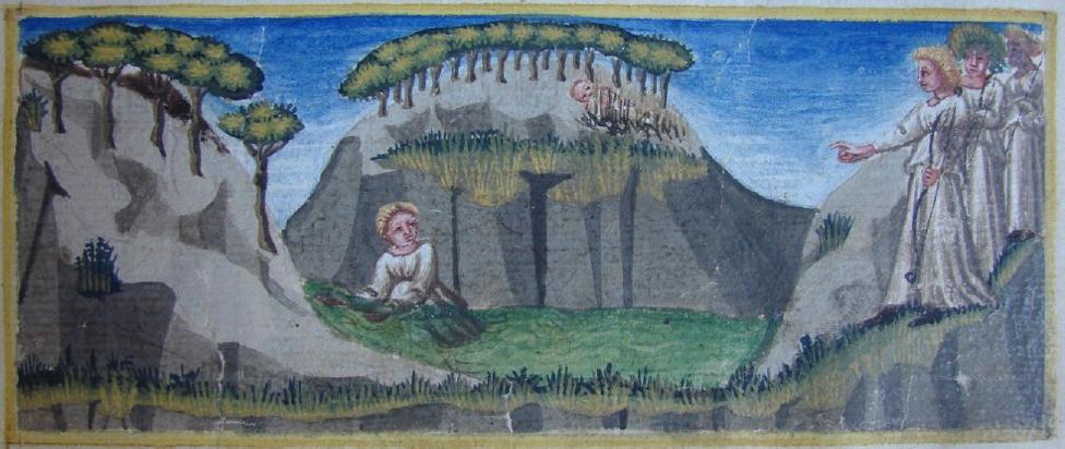 Venezia, Biblioteca Nazionale Marciana, It. IX. 63, f. 52r. Diana trasforma Mensola in un ruscello, dopo che questa ha nascosto il figlio Pruneo in mezzo ad un cespuglio.