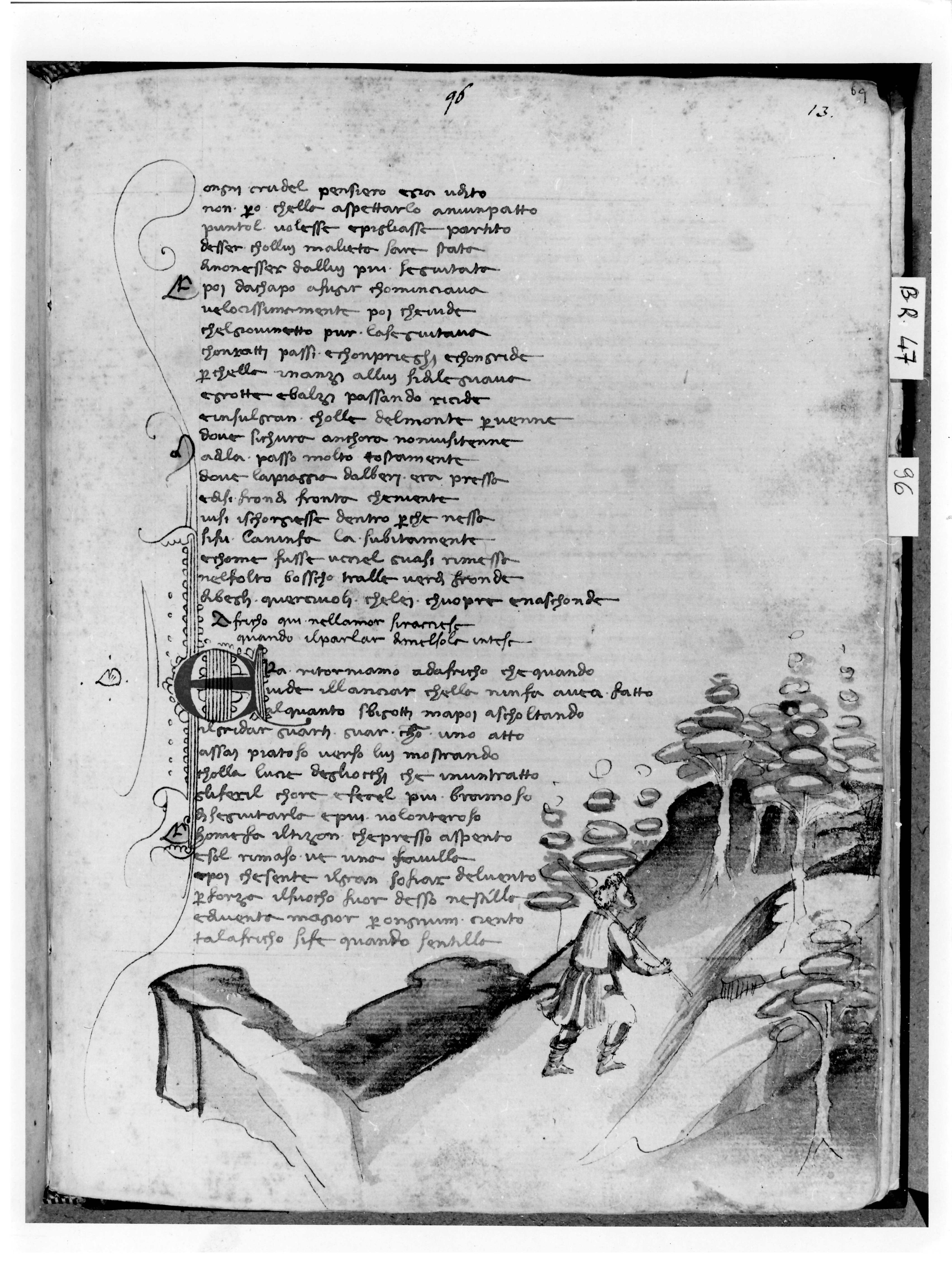 Firenze, Biblioteca Nazionale Centrale, B. R. 47, f. 96r. Africo segue Mensola sulla collina portando un bastone sulle spalle.