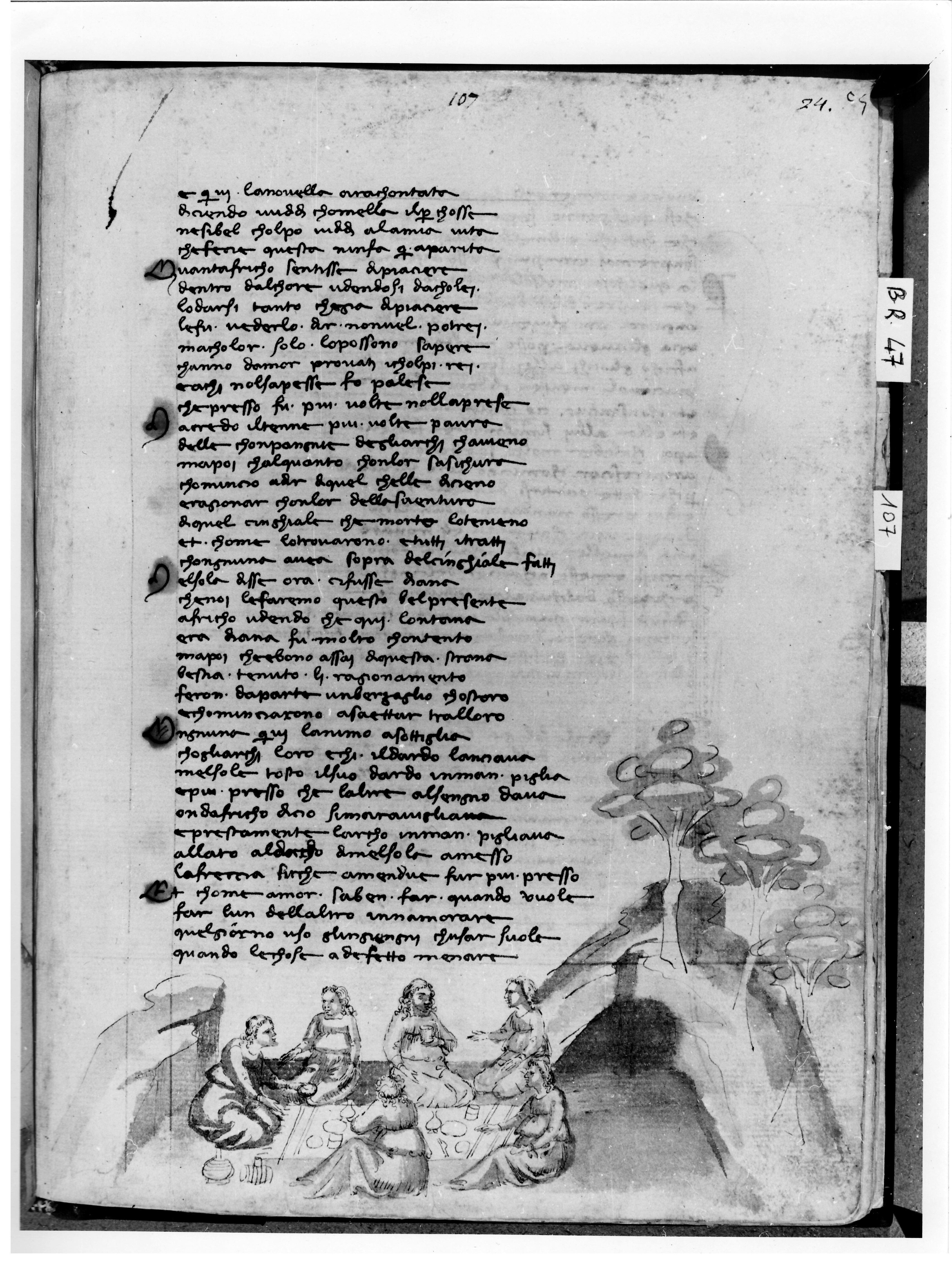 Firenze, Biblioteca Nazionale Centrale, B. R. 47, f. 107r. Africo banchetta con le ninfe seduto in un paesaggio roccioso.