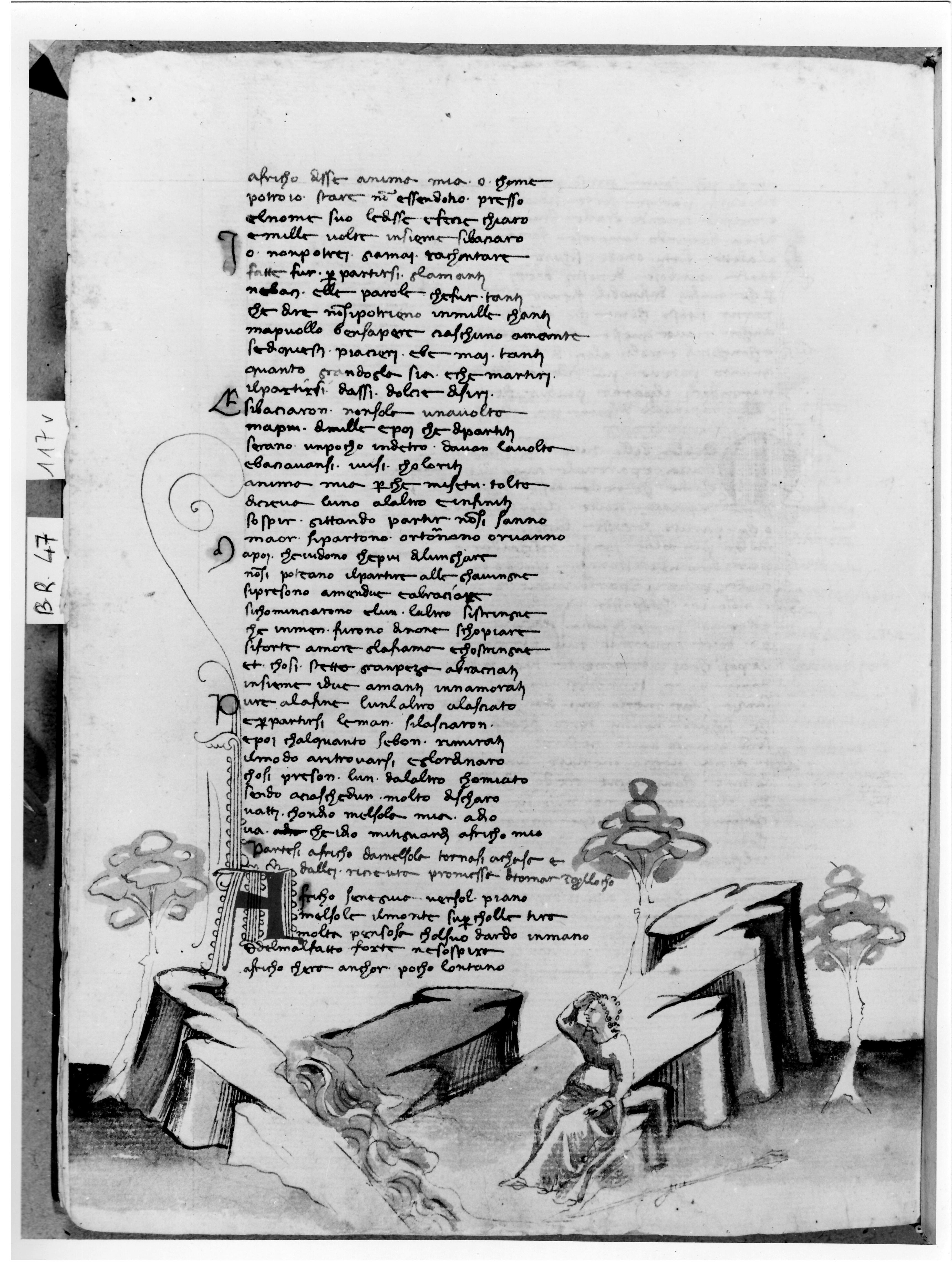 Firenze, Biblioteca Nazionale Centrale, B. R. 47, f. 117v. Africo siede nei pressi di una sorgente in atteggiamento malinconico.