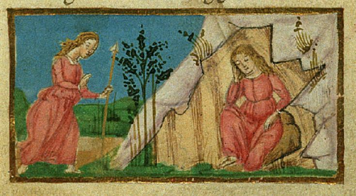 Firenze, Biblioteca Riccardiana, Ricc. 1503, f. 85r. Il copista del manoscritto, datato 1482, è Nicola Mangona. Mensola torna nella sua grotta e ripensa al suo incontro con Africo.