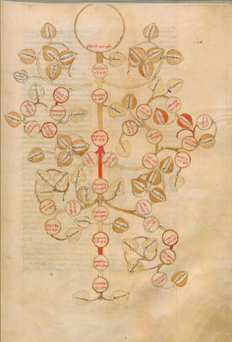 Firenze, Biblioteca Medicea Laurenziana, Plut. 52.9, f. 22r. Manoscritto autografo di Giovanni Boccaccio. Albero genealogico di Etere.