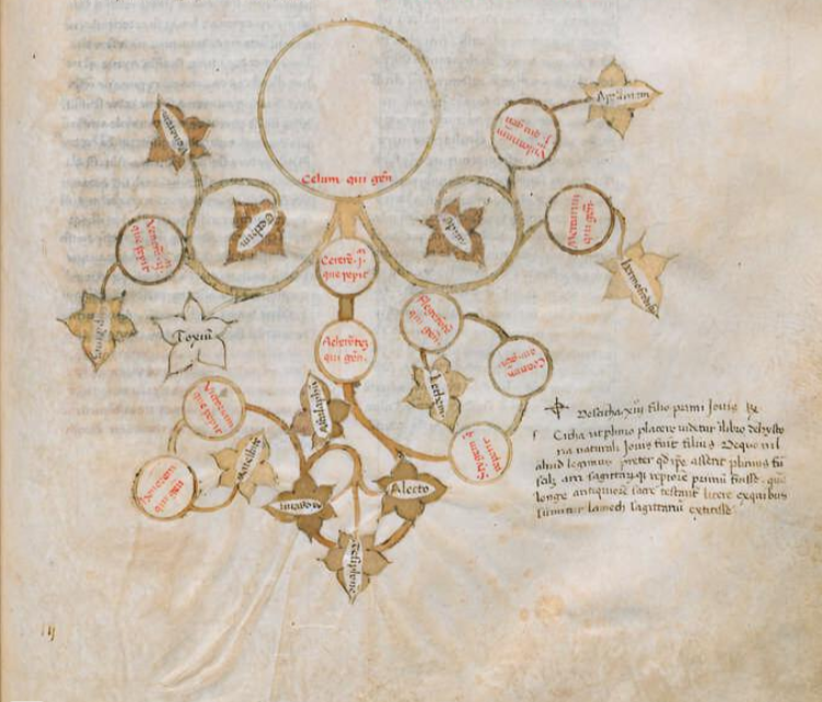Firenze, Biblioteca Medicea Laurenziana, Plut. 52.9, f. 31r. Manoscritto autografo di Giovanni Boccaccio. Albero genealogico di Celo.