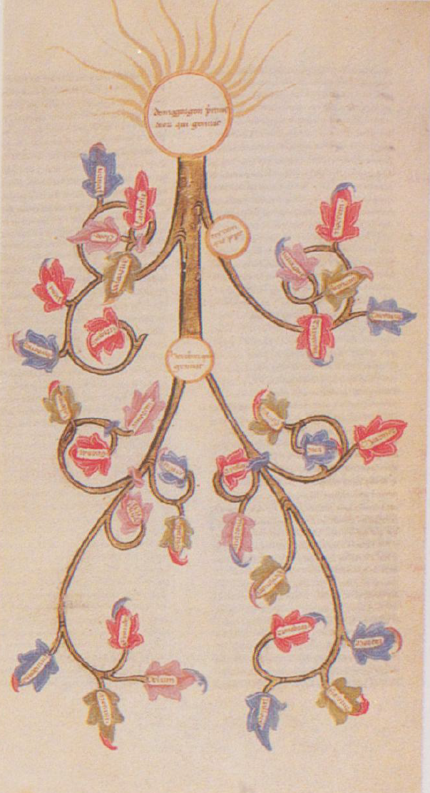 Londra, British Library, Egerton 1865, f. 15v. Il manoscritto è datato 23 giugno 1388. Albero genealogico di Demogorgone.