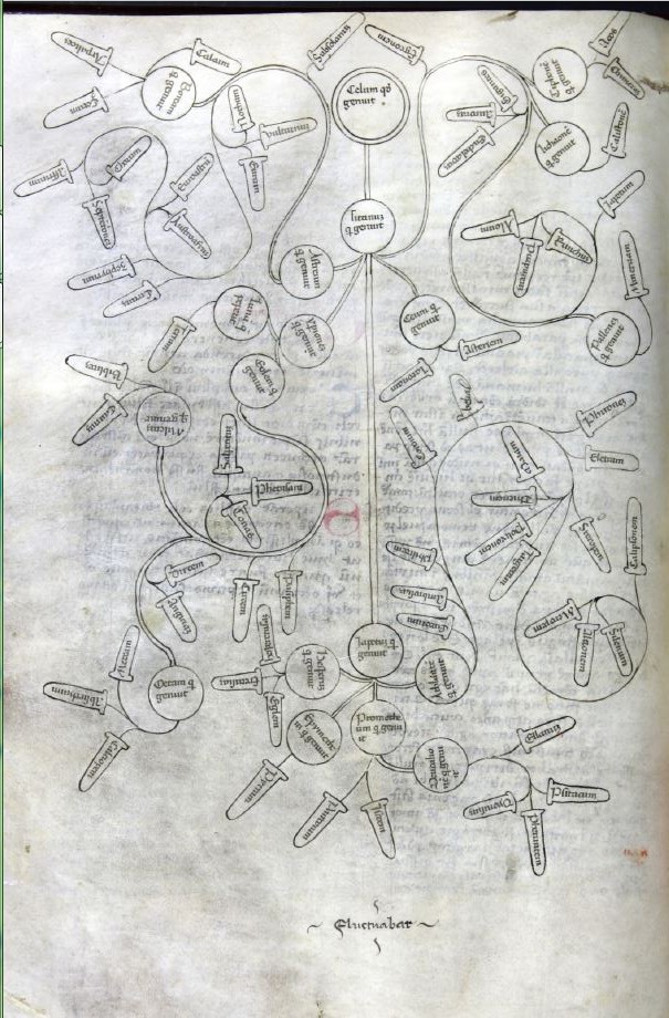 València, Universitat de València. Biblioteca Històrica, BH Ms. 291, f. 40v. Albero genealogico di Celo e Titano.