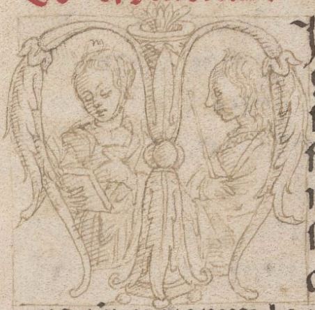 Cambridge (Mass.), Harvard University, Houghton Library, Richardson 41, f. 2r. Due figure femminili, la prima intenta a leggere un libro e la seconda ritratta di profilo con una bacchetta, all'interno dell'iniziale figurata M(inerva).