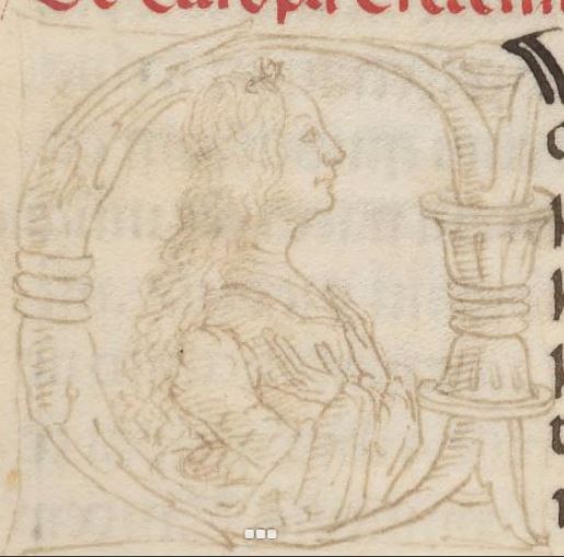 Cambridge (Mass.), Harvard University, Houghton Library, Richardson 41, f. 3v. Busto di Europa con le braccia incrociate sul petto, all'interno dell'iniziale figurata E(uropam).