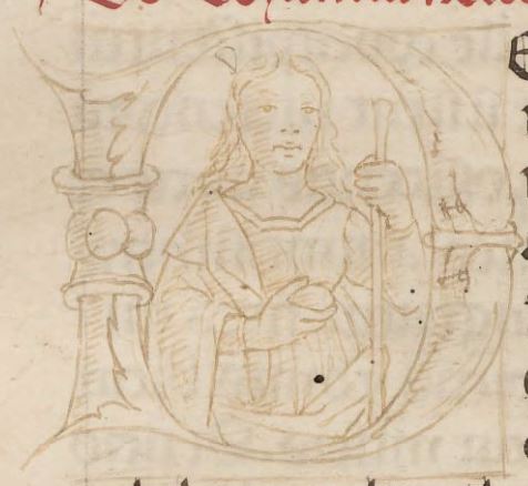Cambridge (Mass.), Harvard University, Houghton Library, Richardson 41, f. 6v. Donna con uno scettro e una sfera, all'interno dell'iniziale figurata D(eyanira).