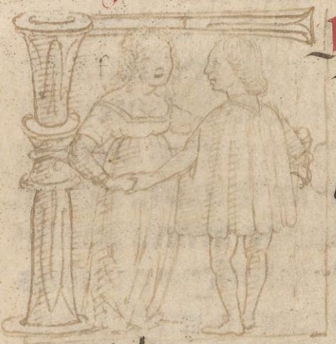 Cambridge (Mass.), Harvard University, Houghton Library, Richardson 41, f. 8v. Due giovani si tengono per mano (Flora ed Ercole oppure Flora e Zefiro?), all'interno dell'iniziale figurata F(loram).