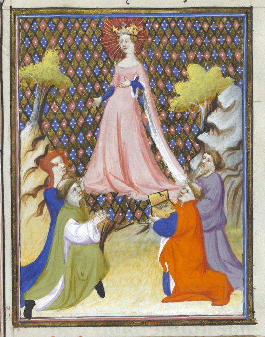 Bruxelles, Koninklijke Bibliotheek van België, 9509, f. 12v. La dea Giunone riceve doni e onori dai suoi devoti.