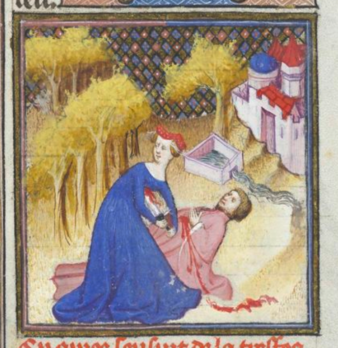 Bruxelles, Koninklijke Bibliotheek van België, 9509, f. 21v. Tisbe si suicida pugnalandosi accanto al corpo di Piramo.