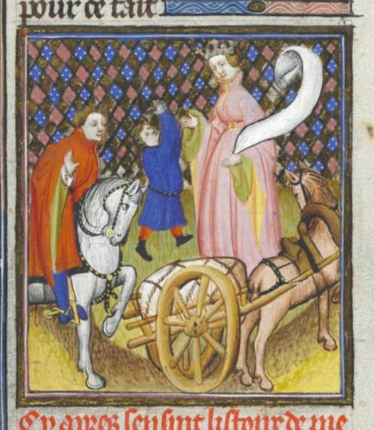 Bruxelles, Koninklijke Bibliotheek van België, 9509, f. 27v. Medea, con un filatterio posto sul braccio sinistro, insieme al piccolo Apsirto osserva Giasone partire con i tesori di Eete.