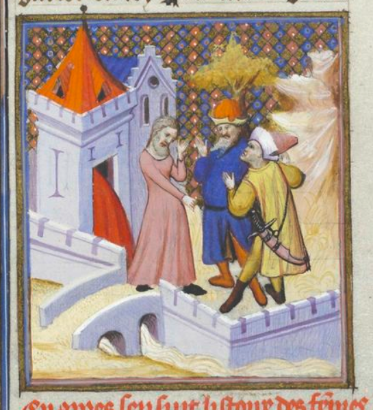 Bruxelles, Koninklijke Bibliotheek van België, 9509, f. 43r. Il marito di una menia esce di prigione travestito da donna.