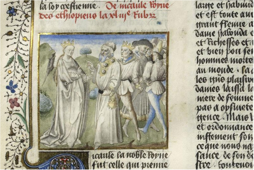 Chantilly, Bibliothèque du Château de Chantilly, 856, f. 72v. La regina di Saba fa visita a Salomone.