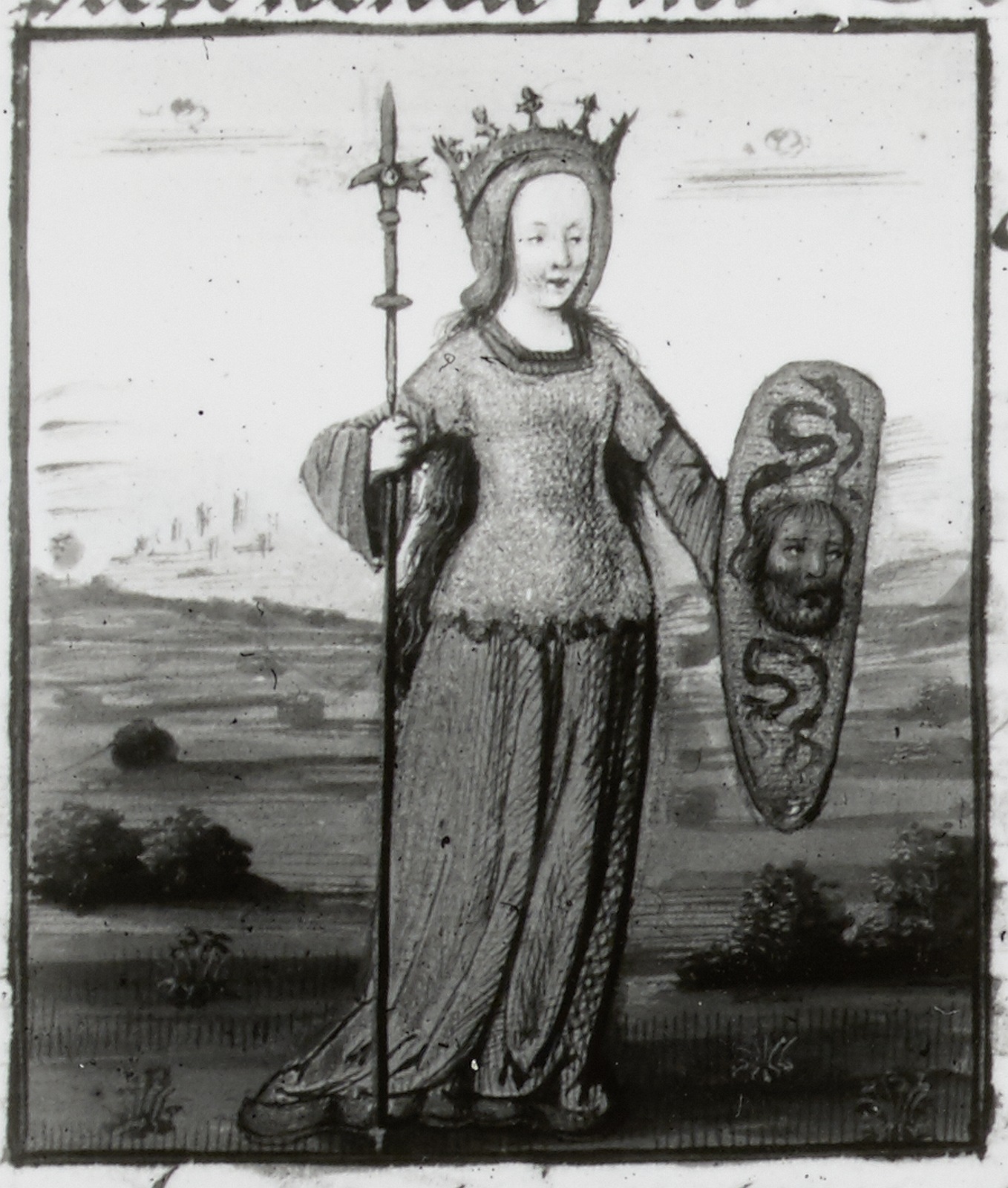 Dresda, Sächsische Landesbibliothek, F 171 b, f. 12r. La dea Minerva regge un alabarda e uno scudo raffigurante la testa della Gorgone.