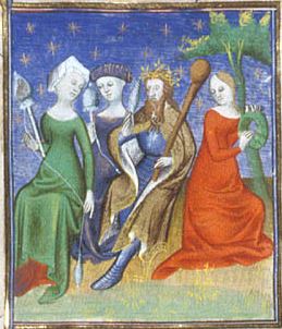 Londra, British Library, Royal 20 C V, f. 34v. Iole, con una ghirlanda tra le mani, siede nel giardino accanto ad Ercole, insieme a due fanciulle che filano.