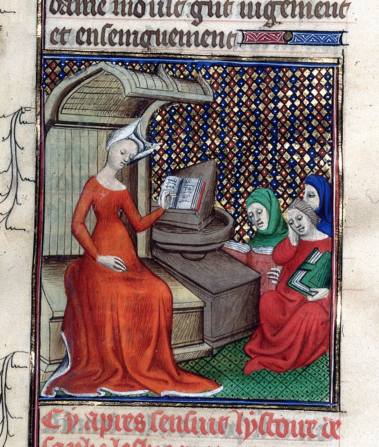 Londra, British Library, Royal 20 C V, f. 75v. Saffo, seduta in cattedra, legge un volume a due uomini e una donna.