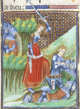 Londra, British Library, Royal 20 C V, f. 78v. Tamiri, regina di Scizia, decapita Ciro sul campo di battaglia.