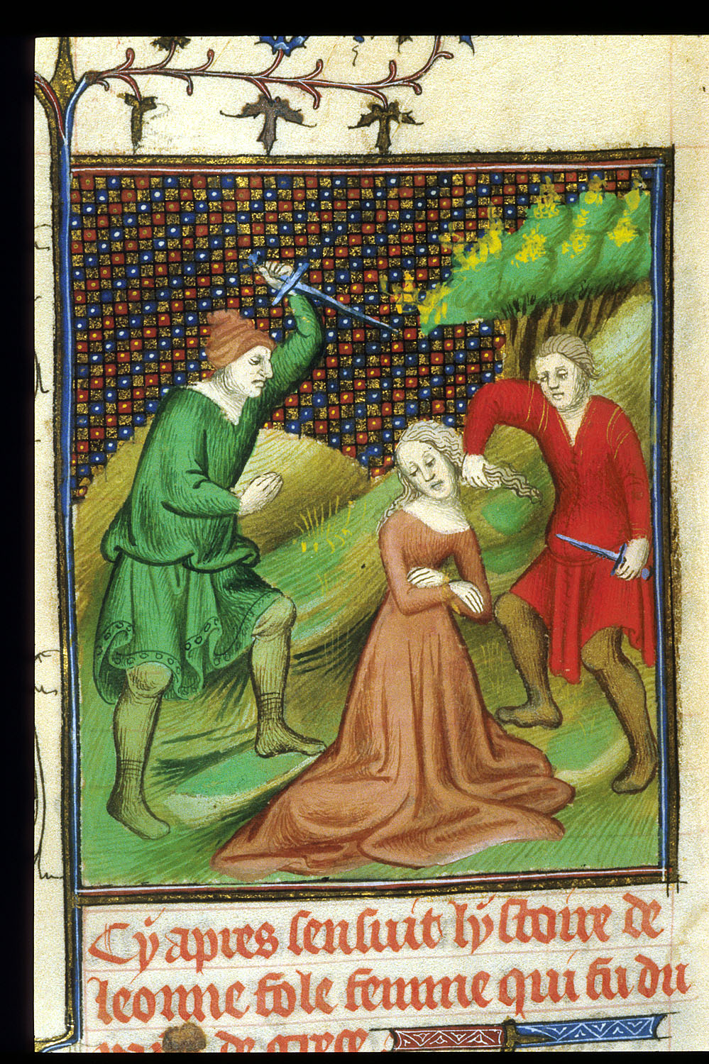 Londra, British Library, Royal 20 C V, f. 80r. Leena subisce il supplizio per mano di due aguzzini.