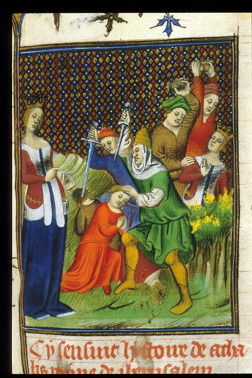 Londra, British Library, Royal 20 C V, f. 82r. Atalia, regina di Gerusalemme, ordina il massacro di tutti i discendenti maschi della stirpe di David; Atalia viene lapidata.