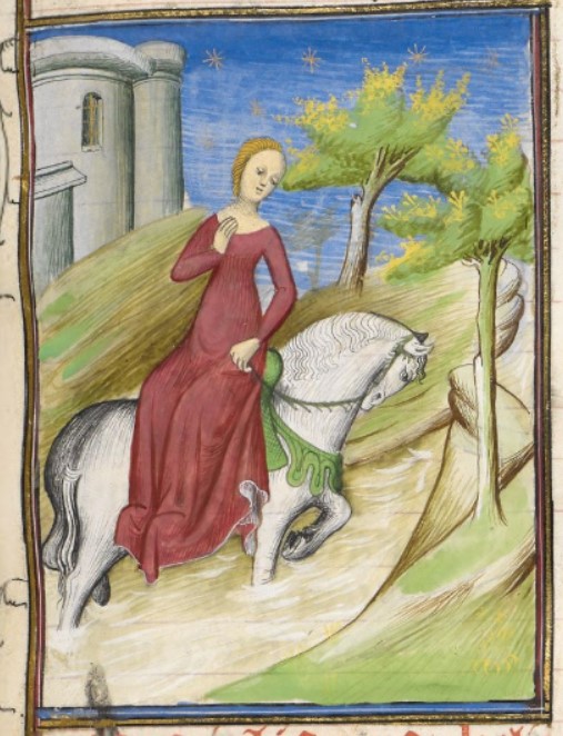 Londra, British Library, Royal 20 C V, f. 85r. Clelia attraversa il fiume a cavallo.